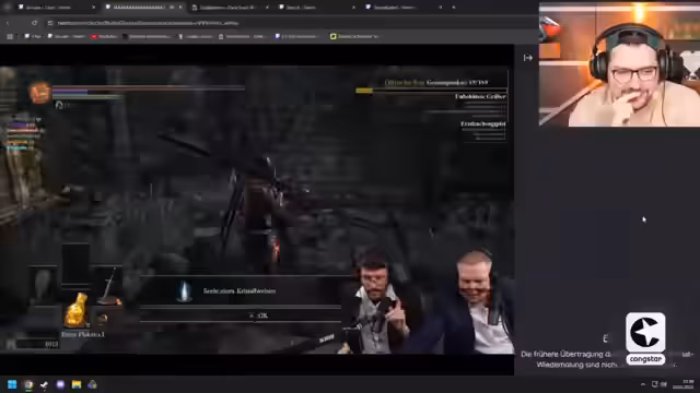 10:29:17Nach dem Sieg über die Abyss Watcher setzt sich der Streamer mit der weiteren Route auseinander. Er plant, Crystal Lizards für Ressourcen aufzusammeln und zum Boss Wolnir zu reisen. Dabei tauchen technische Herausforderungen auf, wie fehlende Informationen im Overlay und Fragen zur optimalen Item-Nutzung, etwa ob man Ringe oder Rüstungsteile anfertigen soll. Der Streamer priorisiert das Sammeln von Seeelen und das Freischalten weiterer Bonfires.