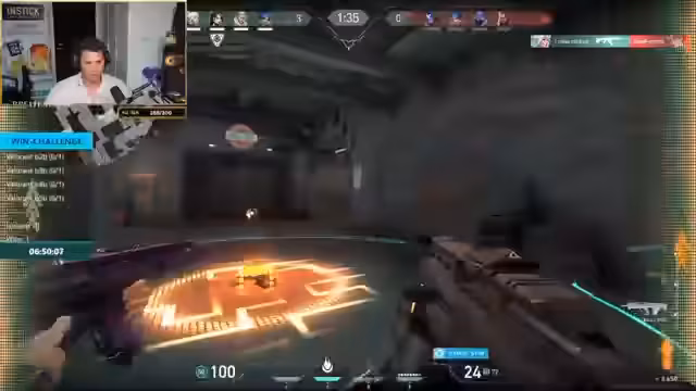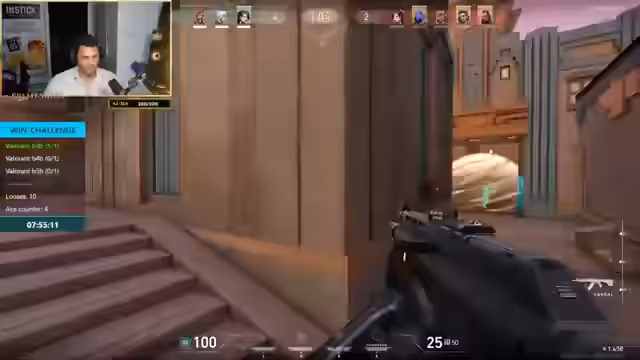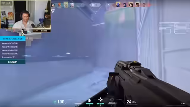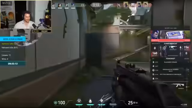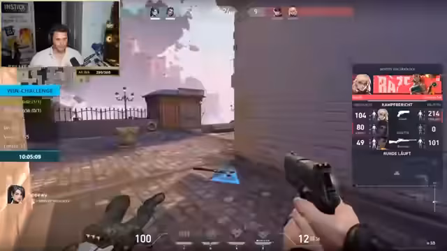 00:19:17Das gemeinsame Spiel beginnt mit der ersten Map. Die Runden verlaufen holprig und das Team erleidet schnell den ersten Verlust, da die Kommunikation und das Spielverständnis noch nicht aufeinander abgestimmt sind. Der Streamer versucht, durch Tipps und klare Ansagen die Teamplay zu verbessern, während die Spieler die Map und die Waffen erst einmal kennenlernen. Die anfänglichen Runden dienen somit als Aufwärmphase und Lernphase für das Team. Ziel bleibt weiterhin, fünf Siege in Folge zu erzielen.