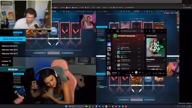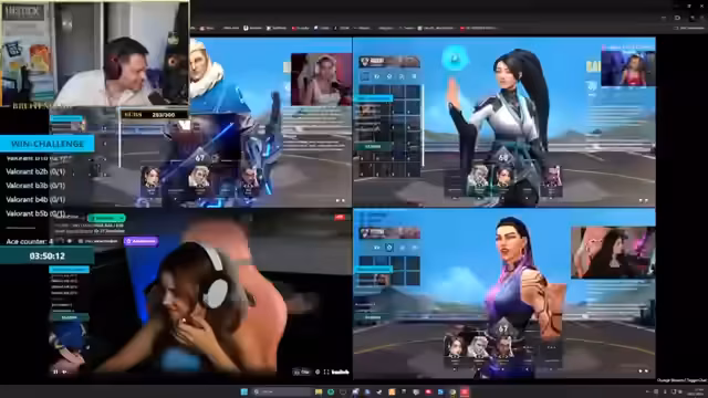 02:16:04Der Stream beginnt mit der intensiven "WIN CHALLENGE", bei der das Team vier Siege erzielen muss, um eine Strafe zu vermeiden. Die Spielerinnen müssen eine aggressive Taktik verfolgen und sich besser auf dem Spielfeld verteilen. Ein "Spike" wird platziert und der Verlust des letzten Lebens eines Verbündeten kommentiert. Die Stimmung im Team ist trotz der anspruchsvollen Aufgabe gelassen, mit dem Vorschlag, gute Laune zu verbreiten und sich gegenseitig zu unterstützen. Die Runde endet mit einem Defizit, was den Bedarf für eine bessere Kommunikation und Konzentration im nächsten Spiel unterstreicht.