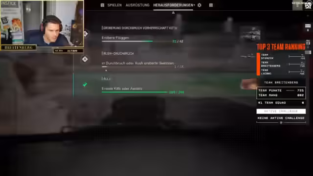03:00:41Nachdem das Team wegen der langen Lobbysuche wertvolle Punkte verloren hat und auf Platz zwei abgerutscht ist, konzentrieren sie sich nun auf die Solo-Challenges, um den ersten Platz zurückzuholen. Jeder Spieler muss Aufgaben wie einen Defibrillator-Kill, einen Triple-Kill und das Erobern von 42 Sektoren und Flaggen erfüllen. Dies erfordert, dass jeder eigenständig im Spiel success und seine Fortschritte verifiziert. Die Streamer betonen, dass es bis zum Ende der Beta Zeit für die Challenges bleibt.