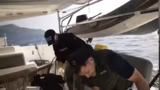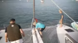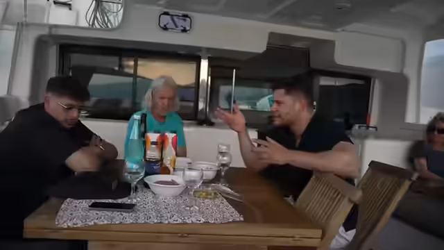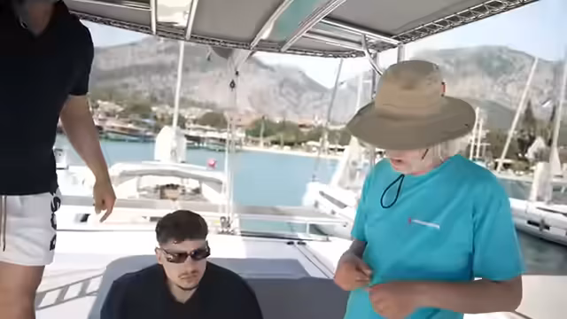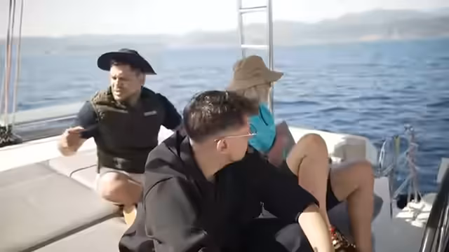 03:48:17Plötzlich wechselt das Thema von einem geplanten Spaß zu ernsteren Notfallszenarien. Es wird ein Mann-über-Bord-Manöver trainiert, bei dem Rami ins Wasser springen soll. Die Vorbereitung gestaltet sich jedoch schwierig, da ein Kabel nicht geöffnet werden kann, was die Ernsthaftigkeit der Situation unterstreicht. Als Rami tatsächlich im Wasser treibt, wird das Seil festgezogen und es stellt sich heraus, wie kraftaufwändig und gefährlich eine solche Rettungsaktion bei Seegang ist.