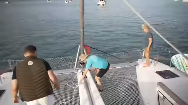 09:02:00Auf dem Segelboat werden technische und hygienische Probleme angesprochen. Die Toilette ist kaputt, was zu logistischen Herausforderungen führt, da Papier im Klo verboten ist. Es werden Pläne geschmiedet, eine Wassermelone im Rettungsring hinter dem Boot herziehen, um sie kühl zu halten und als Snack zu nutzen. Anschließend wird das Ankern vor einem Schiff geübt, das eine selbstholende Winsch verwendet, um das Ankerseil sicher zu bedienen.