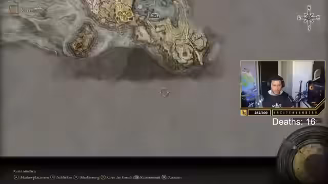 03:37:56Der Streamer erkundet eine neue Spielszene und sucht nach einer Gnade, um seinen Charakter wiederzubeleben. Er nutzt sein Pferd, um sich schneller fortzubewegen, und nutzt dabei den Doppelsprung. Der Chat gibt Hinweise auf die Position der Gnade, doch der Streamer hat Schwierigkeiten, den richtigen Weg zu finden und muss aufpassen, um nicht von Gegnern angegriffen zu werden. Dabei erklärt er dem Chat grundlegende Mechaniken des Spiels, wie z.B. das Entdecken von Kirchen zum Level-Up von Tränken und das Sammeln von Kartenfragmenten, um die Karte zu erweitern.