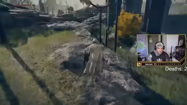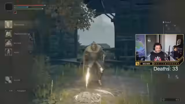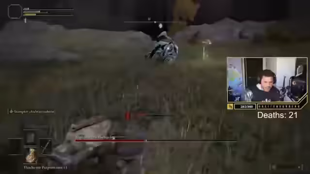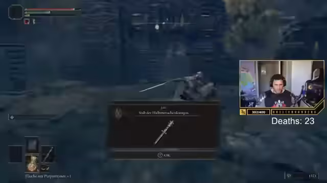 01:48:40Zu Beginn des Streams kämpft der Streamer mit grundlegenden Spielmechaniken und der Steuerung. Er verliert seinen Controller und ist sichtlich frustriert über seine eigenen Fähigkeiten. Nachdem er eine neue Waffe erhält, stellt er fest, dass er diese aufgrund unzureichender Stärke-Attribute nicht effektiv führen kann und sie als "Schmutz" bezeichnet. Es kommt zu Verwirrung über die Bedienung, insbesondere der Tasten für Blocken und Zweihandgebrauch.