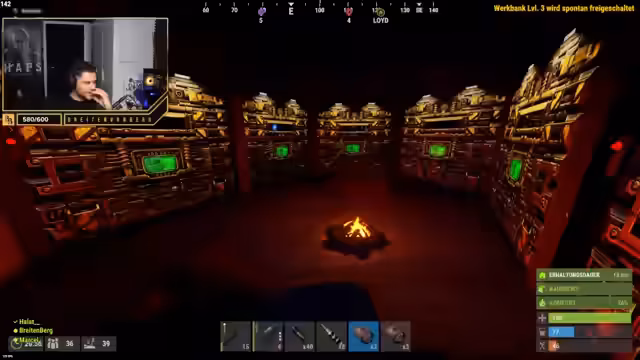 00:13:17Die Auseinandersetzung verlagert sich auf das Management von Ressourcen innerhalb der Basis. Es kommt zu einem Streit über den Recycler und den Abbau von Gegenständen wie Spitzhacken und Revolver. Der Streamer kritisiert, dass sein Teamkollege Hallad unproduktive Aktionen durchführt, während er selbst aktiv Scrap farmt und beklagt, dass sein gefarmtes Material nicht fair genutzt wird. Das Team-Verhältnis ist stark belastet.
