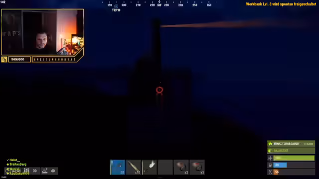 01:21:41Während der Streamer einen eigenen Basisausbau plant, wird ihm von Zuschauern der aktuelle Stand seiner Base erklärt. Er sammelt Ressourcen wie Holz und versucht, sich ein Bett in einer anderen Base zu sichern, die ihm als temporäre Unterkunft dient. Die Szene ist von praktischen Anleitungen im Chat geprägt, die ihm helfen, Baupläne zu craften und mit der Axt oder Hammer Wände und Fenster gezielt zu zerstören, um an Loot zu gelangen.