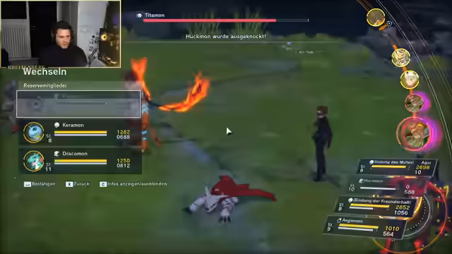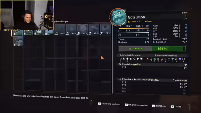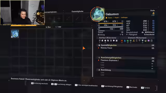 08:49:02Der Streamer beginnt mit der Untersuchung des Grundgameplays des neuen Digimon-Spiels. Er präsentiert sein anfängliches Team, bestehend aus Drakomon, Gabumon und Agumon, und bewertet deren Stärken und Schwächen. Es besteht anfängliche Verwirrung, welches Digimon man am besten ins Team nehmen und entwickeln sollte. Der Fokus liegt auf den Spezialfähigkeiten, Attacken und der Entwicklung der Digimon, während er versucht, eine ausgewogene und starke Kombination zu finden.