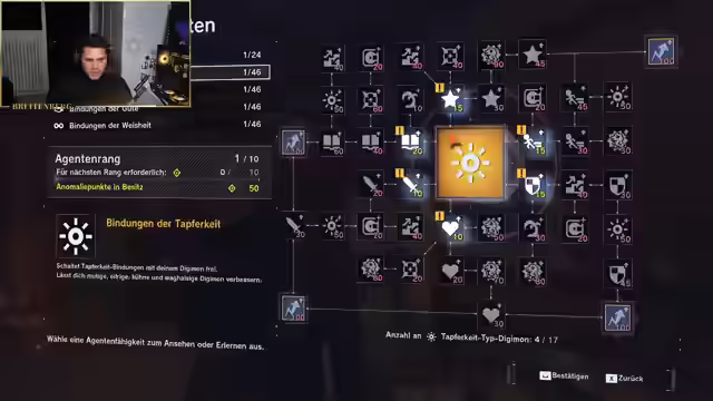 12:08:57Das Spielgeschehen konzentriert sich auf Digimon-Entwicklungen und das Freischalten neuer Fähigkeiten. Es wird die passive Fähigkeit hervorgehoben, die die Stärke aller Digimon erhöht. Die Spielzeit beträgt bereits über fünf Stunden. Es wird ein neues Gebiet erkundet und ein ultra-Level Digimon entdeckt. Die Spielfigur kämpft mit Fäusten gegen Digimon und nutzt Digitationen. Es wird nach Dr. Simmons gefragt. Im weiteren Verlauf kommt es zu einem Kampf gegen einen Ultra-Gremon in einem instabilen Anomalienraum. Es wird überlegt, wie sich bestimmte Digimon entwickeln könnten. Es wird die Agentenstufe 3 erreicht und Anglewomon freigeschaltet. Es folgen intensive Bosskämpfe, bei denen Mega-Digimon eingesetzt werden müssen, um zu bestehen. Der Kampf gegen Parodmon erweist sich als besonders herausfordernd und zeitaufwendig.