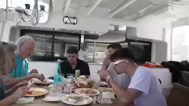 01:38:29Die Mahlzeit an Bord wird vorbereitet und serviert. Es handelt sich um eine einfache, aber gesunde Kombination aus verschiedenen Zutaten wie Käse, Tomaten, Salat, hart gekochten Eiern und Thunfisch. Rami wird der 'Vorsitz' bei der Mahlzeit übertragen und muss diese bezahlen. Es wird über Ernährung und Abnehmen gesprochen, wobei der Professor auf den Instagram-Account seines Coaches verweist. Auch das Thema Essen auf Schiffen wird thematisiert, wobei Professor Kummer von seiner Erfahrung auf einer Pazifik-Überfahrt erzählt, wo die Hygienevorschriften sehr streng waren.
