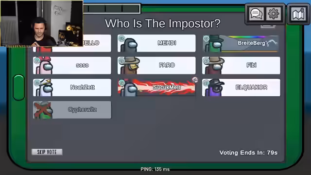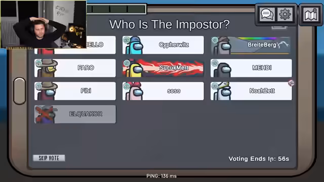 02:03:39Der Streamer schlägt vor, dass die Crewmates gewinnen, wenn es keinen Imposter-Sieger gibt. Dafür verspricht er 5 Subs an den Streamer, falls kein Imposter gewinnt. In der folgenden Abstimmung bei 7 Spielern wird der Streamer, der ein Alibi hatte, trotzdem herausgewählt, was zu Verwirrung und Frust führt. Er ist perplex, dass Teammitglieder mit alibigegen ihn voten.