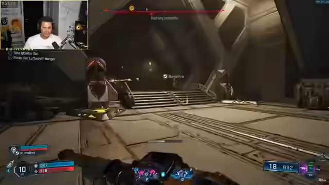 00:03:45Nachdem sich der Streamer mit den Grundlagen vertraut gemacht hat, trifft er auf einen Gegner, der stark an den Zeitwächter erinnert. In einer Cutscene wird der Protagonist RJ vom Zeitwächter getötet und durch einen Bolzen kontrolliert. RJ ist jedoch ein Kammerjäger des Crimson-Widerstands, befreit den Streamer und bietet ihm an, sich ihnen anzuschließen. Gemeinsam erkunden sie die Umgebung, kämpfen gegen Roboter und konfrontieren den Zeitwächter, der jedoch stark genug ist, um RJ zu töten und den Streamer wieder unter seine Kontrolle zu bringen.