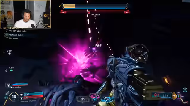 02:34:04Nach der Entdeckung eines bossähnlichen Gegners namens Fatom beginnt ein intensiver und hektischer Kampf. Der Streamer kämpft mit Raketen und verschiedenen Waffen, um dessen Schild und Lebenspunkte zu reduzieren. Es gelingt ihm, eine mächtige 'Booming Singularity Impact Granate' zu looten, die Feinde anzieht und Explosivschaden verursacht. Obwohl der Kampf schwierig ist und er mehrmals stirbt, feiert er den Sieg und die Belohnungen, die ausgeschüttet werden.