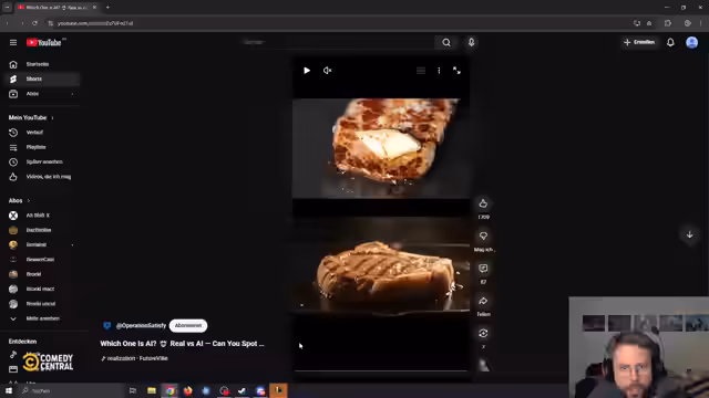 05:28:43Ein interaktiver Teil des Streams ist ein KI-Detektions-Test, bei dem der Streamer anhand von kurzen Videos raten muss, ob diese echt oder künstlich generiert sind. Er fällt dabei teilweise auf die Tricks herein und analysiert, woran man künstliche Videos oft erkennen kann, z.B. durch eine zu perfekte Bildkomposition. Anschließend wird die wachsende Gefahr der KI-gestützten Desipation im Internet angesprochen, bei der KI-Artikel von anderen KIs zitiert werden und die Informationsqualität dadurch massiv sinkt.