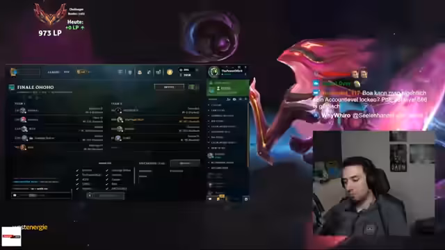 05:46:28Im Finale des Turniers wird das letzte Game intensiv analysiert. Es wird diskutiert, warum Team Soloth gewonnen hat, und die Leistung von Tristan Schrage wird als 'tilted as fuck' beschrieben. Der Streamer ist überrascht von der Stärke einiger Spieler, wie Henki, und bewertet die allgemeine Leistung der Pros. Es werden Matchup-Probleme aufgezeigt, insbesondere im Mid-Lane-Duell gegen Kayle. Trotz der knappen Niederlage, die als 'schade' und 'bitter' empfunden wird, lobt der Streamer das Turnier als 'krankes Finale' und unterstreicht den hohen Unterhaltungswert.