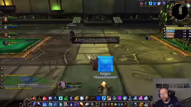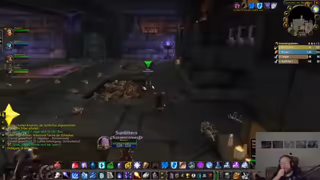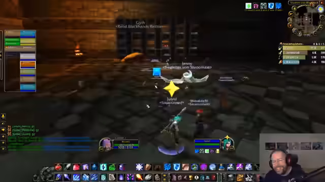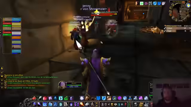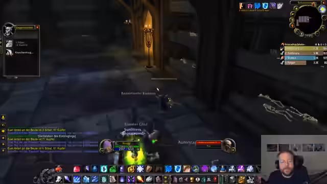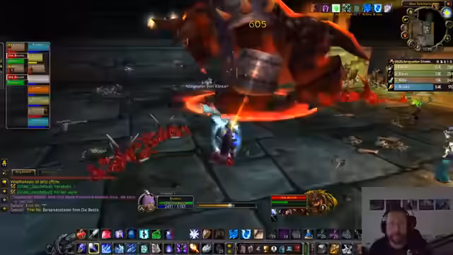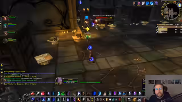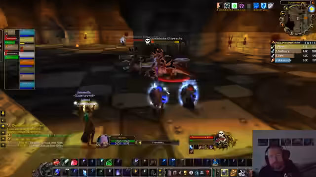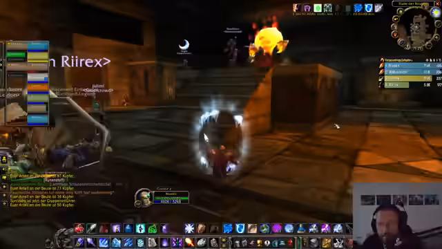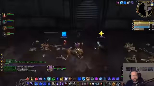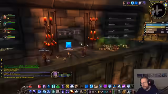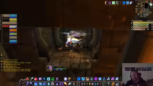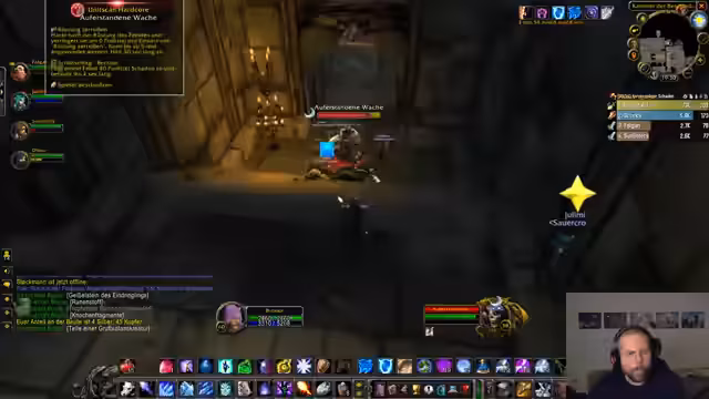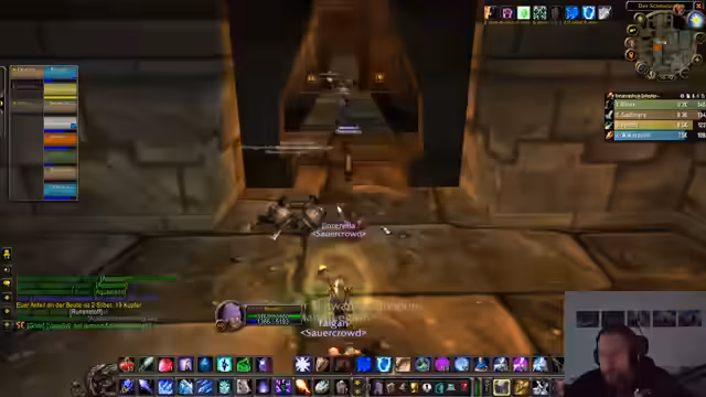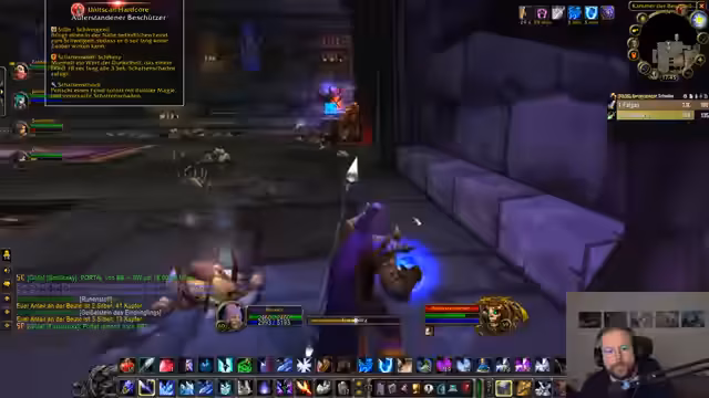 06:40:05Die Gruppe teleportiert sich nach Stormwind, um sich mit neuen Quests zu versorgen. Anschließend wird der nächste Dungeonraum betreten, der als sehr unangenehm beschrieben wird. Hier werden neue Mobs mit spezifischen Fähigkeiten wie Silence und Volley eingeführt. Die Taktik für diesen Raum erfordert Fokus auf einen Okkultisten, um seine Verwandlung in einen Geist zu erzwingen, da dieser danach immun gegen physischen Schaden wird. Das Ziel ist es, einen dieser Geister schnell zu eliminieren, um den AOE-Schaden der Gruppe zu reduzieren.