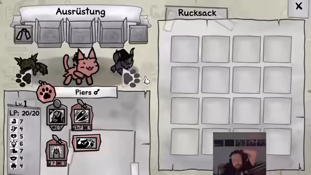 03:12:13Der Streamer präsentiert seine Katzen-Gang für den Run: Pierce, Puron, Wansi und Bungee. Er weist den Kleriker, den Krieger und den Dieb seinen Katzen zu. Er zeigt die Kampfszene, in der er einen Gegner mit Pierce niedermacht, und erklärt die grundlegende Mechanik des Kampfes. Nach dem ersten Kampf beginnt er, die Umgebung zu erkunden und nach Items zu suchen, wobei er eine Heilung und Gold findet.