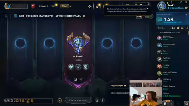 01:43:04Nach dem League-Spiel interagiert der Streamer wieder intensiv mit der Community. Er führt eine Umfrage durch, um zu entscheiden, ob er Solo Queue oder Flex Queue spielen soll, und ist überrascht von der hohen Wahlbeteiligung. Nachdem Flex Queue gewählt wird, kündigt er an, um 18 Uhr ein Flex-Q-Game zu organisieren und bittet die Zuschauer, ihm im Discord beizutreten. Er wechselt zurück zu '9 Kings', um eine weitere Runde zu spielen, bleibt aber frustriert über die erschwerte Schwierigkeit.