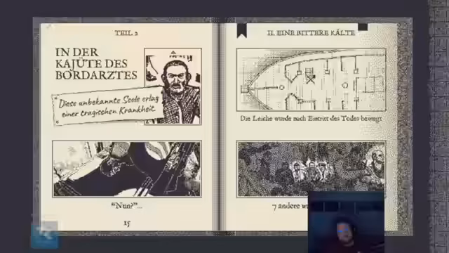 00:10:17Nach dem Ende des TFT-Turniers wechseln wir das Genre für den Abend. Anstatt weiter an 'Lies of Pi' zu arbeiten, wird das hoch bewertete Story- und Puzzle-Spiel 'The Return of the Obra Dinn' gestartet. Das Spiel ist im Jahr 1803 angesiedelt und handelt von der Rückkehr eines verschollenen Schiffes. Man soll das Schicksal der 51köpfigen Besatzung aufdecken, indem man Leichen identifiziert und die Umstände ihres Todes ermittelt.