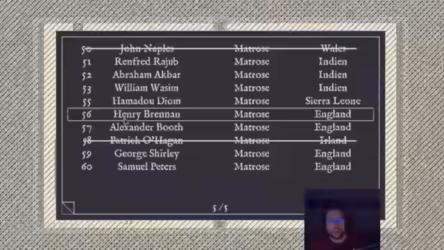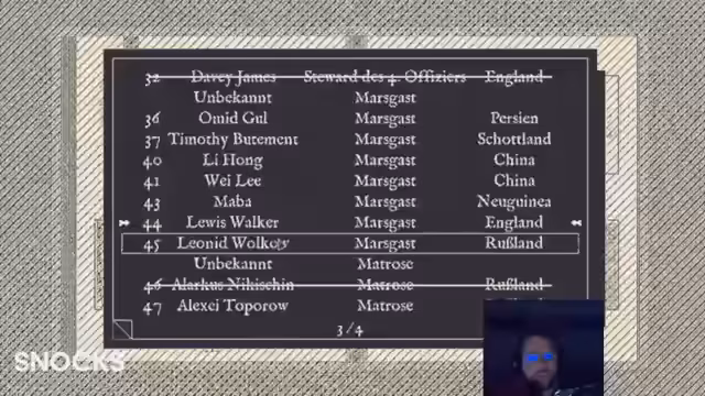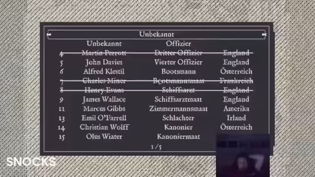 01:57:13Der Stream beginnt mit der Analyse von Bildern der Schiffbesatzung. Es werden verschiedene Charaktere identifiziert und zugeordnet, wie der Schiffsarzt Henry Evans und der Bordschaffner Sayed. Die Hauptaufgabe besteht darin, die Identität der Crewmitglieder zu klären und ihre Schicksale zu ergründen. Ein besonderer Fokus liegt darauf, die Gesichter den Namen und Rollen an Bord zuzuordnen, was anfangs als sehr kompliziert und fordernd beschrieben wird, da viele Gesichter nicht mehr klar zu erkennen sind.
