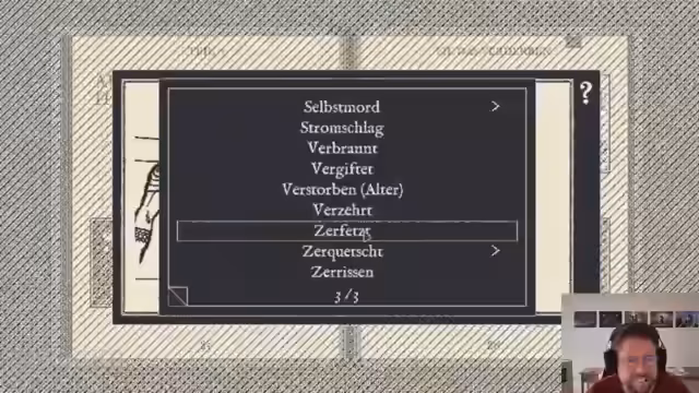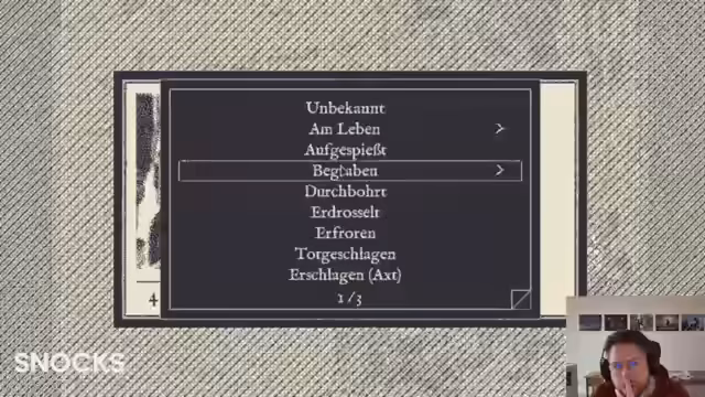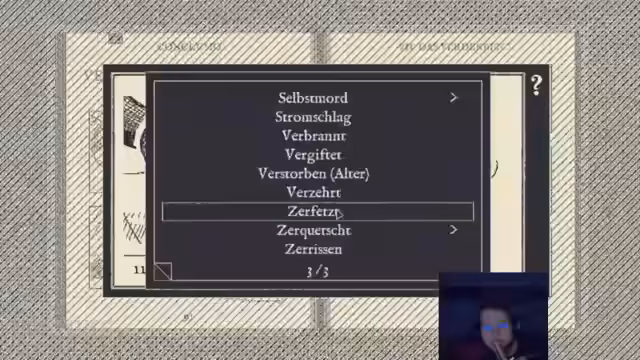 02:02:13Die Analyse wird schrittweise von Leiche zu Leiche vorangetrieben. Der Streamer sammelt Informationen über Todesursachen wie Aufspießen, Erschießen, Enthaupten und Ertränken. Viele Todesfälle sind mit übernatürlichen oder unbekannten Angreifern verbunden, wie Bestien oder Monstern. Die Aufklärung wird durch die Notwendigkeit erschwert, aus den fragmentierten Informationen die genauen Umstände und Verursacher jedes Todesfalls zu rekonstruieren und zuzuordnen.