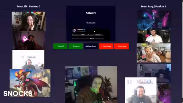 04:28:48Nach technischen Vorbereitungen startet ein Quiz mit der klaren Regel: Alte gegen Junge. Das Quiz ist bewusst 4 gegen 5 angelegt, um den Altersvorteil der älteren Gruppe auszugleichen. Es besteht aus verschiedenen Arten von Fragen, darunter Tweet-Zuordnungen, Champion-Erkennungen und Spielwissen, wobei Teamfragen mehr Punkte wert sind als Bonusfragen. Der Verlauf ist geprägt von intensiven Diskussionen innerhalb der Teams und humorvollen Interaktionen zwischen den Gruppen.