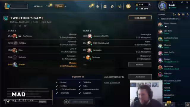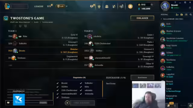 05:21:36Das Quiz ist vorbei, und das Hauptevent startet: ein gemeinsames League of Legends-Spiel. Es gibt technische Schwierigkeiten beim Einladen der Spieler in die Lobby, was zu kurzen Verzögerungen führt. Nachdem alle Probleme gelöst sind, wird das Team aufgeteilt, mit Fokus auf ausgewogene Rollen und Main-Rollen. Die Champions werden gepickt, mit einem Fokus auf eine synergistische Bot-Lane und einen soliden Jungle-Plan. Es herrscht ein entspannter, aber ehrgeiziger Geist im Team.