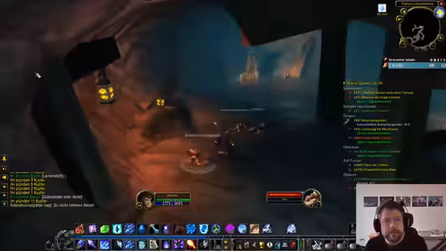 04:03:27Das Gameplay im ZF Dungeon umfasst Buff-Management mit großen Gruppen-Buffs, die Mana kosten, und die Besiegung mehrerer Bosse. Die Gruppe koordiniert AoE-Schaden und Tanking, erwähnt Erfolge wie den Tod von Jinji und den Erhalt von Loot wie Einhandkolben. Interaktionen mit NPCs wie dem Goblin für Quests und die Vorbereitung auf die Endbosse werden gezeigt. Spieler wie Niklas erreichen Level 49, und die Gruppe planung weitere Dungeons und Quest-Abgaben nach dem Erfolg.