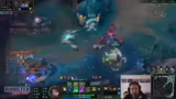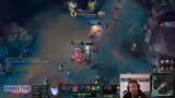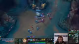 02:57:07Im Mittelspiel konzentriert sich der Streamer auf das Sammeln von Gold und Stacks auf seinem Champion. Er kritisiert das mangelnde Spielverständnis des gegnerischen Teams und deskt speziell den Jungle-Spieler, der Diamond 1 ist aber nach Meinung des Streamers sehr schlecht spielt. In einem Teamfight gelingt es dem eigenen Team, eine gute Position zu beziehen und durch gezielte Abilities, wie Nami-Bubble, einen Vorteil zu erzielen. Ein gegnerischer Spieler wird von seinem Team isoliert und getötet, was zu einer klaren Führung im Spiel führt.
