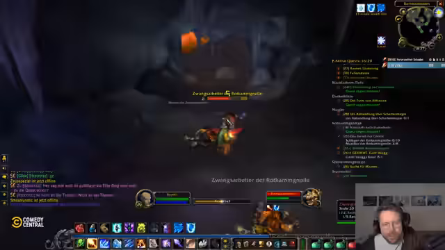 08:57:09Das Team wechselt ins Rotkammgebirge, um Kopfgeldquestes wie 'Gesucht: Leutnant Fangor' und 'Bedrohung durch die Blackrock' zu erledigen. Sie bilden eine Gruppe mit einem Jäger namens Koschinski und diskutieren die Schwierigkeit der Elite-Mobs, sind aber durch ihr hohes Level überlegen. Nebenbei plant der Streamer, am nächsten Tag mit Maxi Markov zu questen, um von Level 13 auf 24 zu gelangen. Die Gruppe erwägt auch Dungeon-Starts wie Gnomeregan, merkt aber, dass einige Members dafür noch zu niedrig levelt sind.