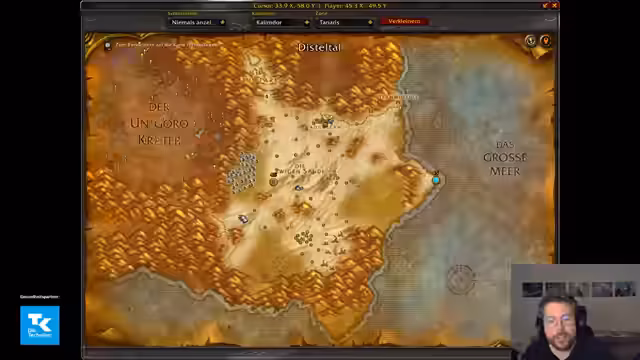 04:34:39Nach dungeonbegleitendem Questing in Feralas plant der Streamer den Rückweg mit Gruppenmitgliedern. Er erwähnt Loot-Chancen (z. B. Stab mit 36 Frost-Schaden) und betont Respekt in der Kommunikation: 'Nicht anschreien', sondern konstruktiven Austausch fördern. Kooperationswillen zeigt die Einladung zu gemeinsamen Events ('Tugetti'), wobei 6-Slot-Gruppen für Dungeons genutzt werden. Kritisch wird die verbuggte Umgebung (Brücken in Maraudon) kommentiert.