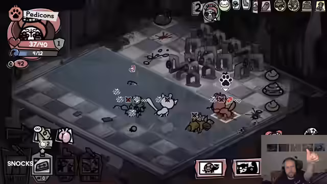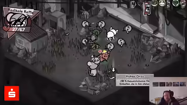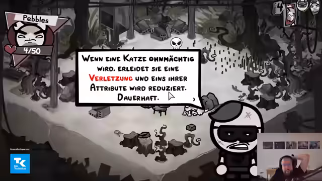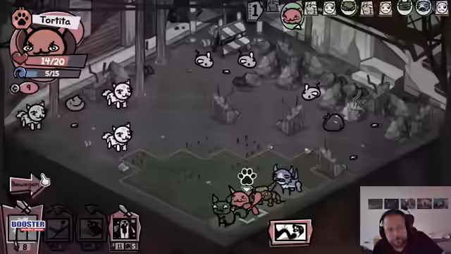 06:12:32Der Streamer führt seine Katzen-Crew durch einen Dungeon, wobei er sich mit verschiedenen Gegnern auseinandersetzen muss. Die Kämpfe erfordern ein hohes Maß an strategischem Denken, da Gegner wie Klapperschlangen und Flöhe mit spezifischen Mechaniken und Schwachpunkten aufwarten. Er analysiert seine Züge, optimiert seine Fähigkeiten und versucht, die richtigen Items für seine Katzen zu finden, um stärker zu werden.