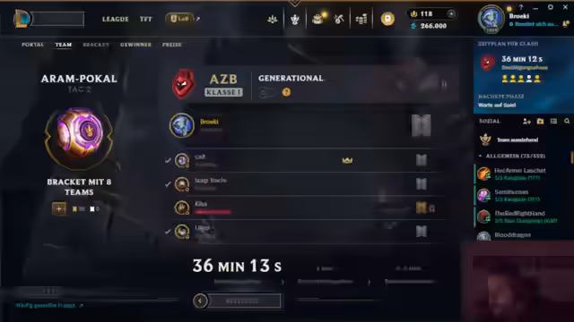 01:34:59Nach den Vorbereitungsspielen in Arena beginnt der Aram-Clash. Der Streamer ist verärgert über den organisatorischen Zustand des Teams. Er bemerkt, dass 'Tristan' das Team aufgelöst hat, um stattdessen mit einem anderen Team zu spielen. Es herrscht Unklarheit über die genaue Zusammenstellung und Anwesenheit aller Mitspieler wie 'Lilip' und 'Kiba'. Der Streamer beschreibt dies als 'schwach' und 'fucking', was auf eine chaotische und unprofessionische Vorbereitung hindeutet und die Konzentration auf das bevorstehende Match beeinträchtigt.