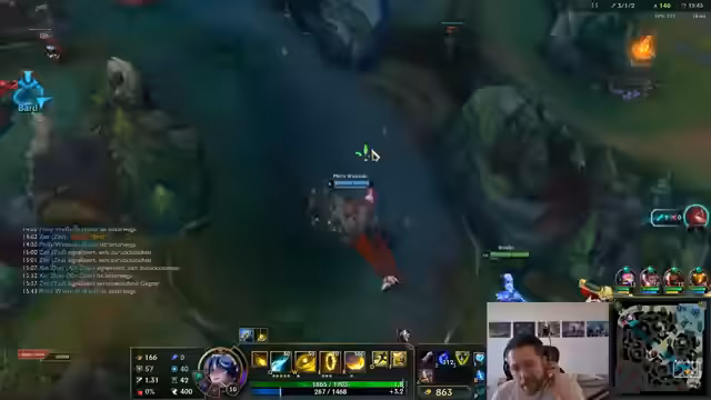 02:09:39Zurück im Spiel konzentriert sich der Streamer auf den Spielfluss. Er analysiert die Wellenbewegungen, den Mana-Verbrauch und seine Positionierung im Lane-Phasen-Duell. Er arbeitet daran, Vision im gegnerischen Jungle zu etablieren und sucht nach gezielten Engages. Obwohl er die Oberhand in der Lane hat, bleibt er besorgt über das fehlende Engagement des restlichen Teams und fehlende Map-Kontrolle.