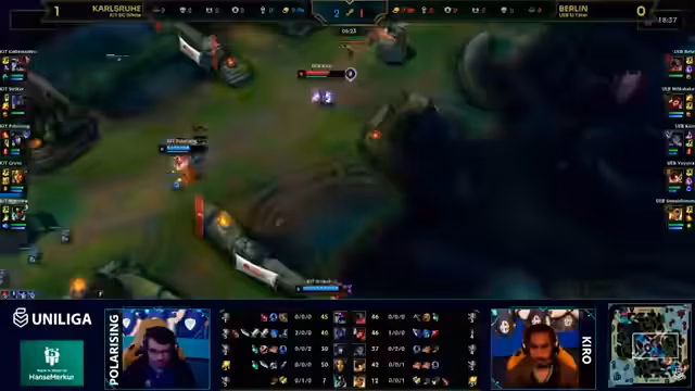 04:03:04Während des Spiels werden Entscheidungen und Aktionen der Teams analysiert. Berlin profitiert von early Kills und gainst den ersten Drake. Ein schön gespielter Turnaround gelingt Kit SC, als sie Milkshake einen beschaffen Kill ermöglichen. Die Lane-Assignment wird als schwierig für Kit beschrieben, da sie kaum Priorität in den Lanes bekommen. Die Spielstrategie der Teams zeigt unterschiedliche Ansätze in der Objivkontrolle und im Map-Movement.
