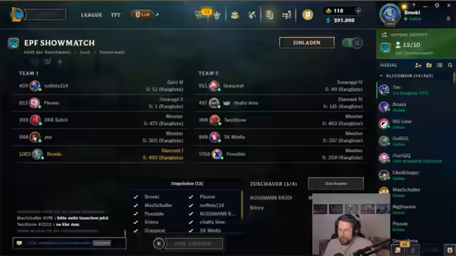 01:41:49Im Rahmen der Charity-Showmatch plant der Streamer einen Raid auf einen anderen Twitch-Account. Er erkundigt sich nach dem aktuellen Sender, um den Raid am Spielende durchzuführen und die Zusammenarbeit mit Partnern zu unterstützen. Dieser Raid soll die Reichweite der Charity-Aktion erhöhen und die Gemeinschaft fördern. Gleichzeitig werden Champion-Tausch-Anfragen für das nächste Spiel vorbereitet.