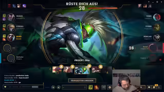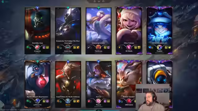 00:00:00Die Spieler diskutieren zu Beginn die Rollenverteilung. Ein Spieler bevorzugt Jungle, zeigt aber Flexibilität für Toplane oder Support. Es folgen Anweisungen zur ordentlichen Anstellung in der Lobby, um Konfusion zu vermeiden. Diskussionen über Bans (insbesondere Lissandra) und erste Pick-Strategien dominieren die Vorbereitungsphase. Ein Spieler erwähnt eine persönliche Wetts mit Tanja und plant, dreimal gegen sie zu gewinnen. Die Champion-Auswahl wird detailliert besprochen, wobei Vex und Ari als mögliche Picks diskutiert werden.