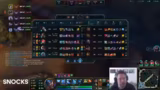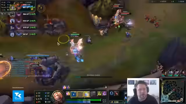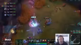 00:08:32Nach dem ersten Ramp-up gibt es eine erfolgreichte Doppel-E von Seraphine, die jedoch durch den nachfolgenden Tod des Volibear-Junglers wieder zunichtegemacht wird. Der Streamer kritisiert das Agieren des Junglers und das mangelnde Map-Bewusstsein des eigenen Teams. Es kommt zu einem erfolgreichen Gank, bei dem vier Kills erzielt werden, gleichzeitig wird jedoch die Lane überpusht, was den Streamer gefährdet. Das Team ist sich der gegnerischen Positionen kaum bewusst und agiert blind auf der Map.