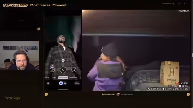 03:05:35Die Kategorie 'Bestes Streamer-Duo' wird kritisiert, da der Streamer selbst nicht nominiert ist und die Kategorie als 'völlig nichts aussagend' empfindet. Er argumentiert, dass viele der nominierten 'Duos' eigentlich Einzelstreamer sind, die nur gelegentlich zusammenarbeiten, anstatt wirklich ein festes Duo zu bilden, das 'sehr, sehr viel zusammen' macht. Er bevorzugt Streamer, die eine größere Gruppe um sich scharen, wie HandOfBlood, da dies das Erstellen von lustigem Content erleichtert. Die Kategorie wird als 'Reichweitenvergleich' abgetan. Anschließend wird die Kategorie 'Most Surreal Moment' vorgestellt, die Momente beschreibt, die auf einem ganz anderen Niveau waren. Ein Clip, in dem eine Karte durch ein Fenster fällt, wird als Zaubertrick und 'trotzdem cool' empfunden. Ein weiterer Clip zeigt den 40-jährigen Rock am Ring Eröffnungsakt mit beeindruckender Qualität des IRL-Streams, was auf ein Team im Hintergrund hindeutet. Die Qualität wird als 'Fernsehniveau' beschrieben, im Gegensatz zu Brahims Handy-Setup, das ständig Verbindungsprobleme hatte. Ein Clip, der Polarlichter auf Island zeigt, wird als 'krass' und 'zehnmal beeindruckender als auf Fotos oder Videos' beschrieben, obwohl der Streamer selbst noch nie Polarlichter gesehen hat. Der Clip von Hanno Blatt mit den Polarlichtern wird als Favorit für den 'Most Surreal Moment' genannt. Die Diskussion geht über in die Kategorie 'Bestes Stream-Crossover', die der Streamer als 'sehr verwirrend' empfindet, da viele Clips Interviews in IRL-Streams zeigen, was seiner Meinung nach kein echtes Crossover ist. Er definiert Crossover als das Einbeziehen einer Person in den eigenen Stream und eine dedizierte Zusammenarbeit. Die Diskussion über die Definition von Crossover wird auf das nächste Mal verschoben.