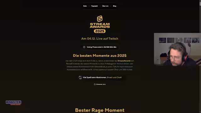00:18:22Nach der technischen Einrichtung eines gemeinsamen Streams, um die Clips parallel anschauen und diskutieren zu können, beginnt die Betrachtung der ersten Kategorie 'Bester Rage-Moment'. Der Streamer und sein Co-Streamer Chad planen, die Clips gemeinsam zu bewerten und danach ihre Stimmen abzugeben. Der Fokus liegt darauf, über die Nominierungen zu diskutieren und persönliche Abstimmungen zu treffen. Besonderes Augenmerk wird auf den Clip von Elotrix gelegt, der im Vergleich zu anderen Nominierungen als besonders humorvoll gilt.