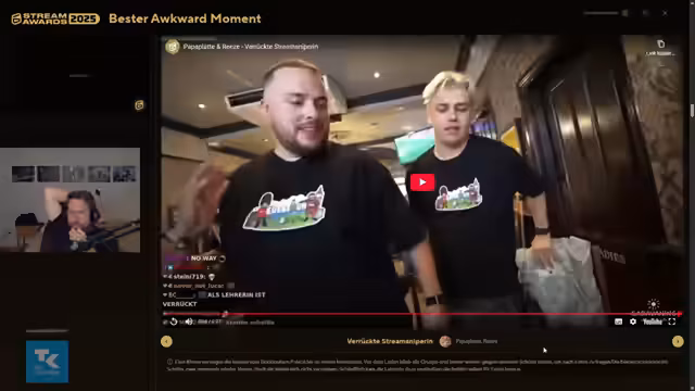 01:40:39Die Bewertung des 'Bester Awkward Moment' fällt äußerst kritisch aus und beleuchtet ethische Grenzen. Ein Clip von Rohat, bei dem er Sex-Roleplay mit einer älteren Person vor einer wahrscheinlich jugendlichen Zuschauerschaft streamt, wird als inhaltlich problematisch und schädlich für minderjährige Zuschauer abgelehnt. Die Kritik zielt auf die Verantwortung der Streamer ab, Inhalte zu schaffen, die nicht sexualisierend sind, da solche Inhalte die junge Zielgruppe negativ prägen können. Der Clip wird trotz seiner unangenehmen, komischen Momente als unwürdig für eine Auszeichnung gesehen.