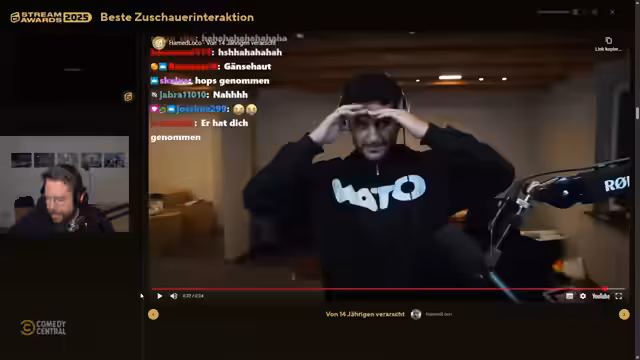 00:34:09Die Kategorie 'Bester IRL-Moment' wird vorgestellt, die das Streamen außerhalb der eigenen vier Wände umfasst. Der erste Clip zeigt einen Streamer, dem ein Vogel auf den Kopf kackt, was als lustig, aber auch als potenziell gestellt empfunden wird. Ein weiterer Clip zeigt einen Vater, der unerwartet in einem IRL-Stream auftaucht, was zu einer humorvollen, aber auch 'komischen' Vater-Sohn-Beziehung führt. Die exklusiven Kniestrümpfe des Vaters werden dabei besonders hervorgehoben. Der Streamer äußert seinen Zynismus gegenüber solchen 'gescripteten' Momenten. Ein dritter Clip zeigt einen Mann, der mit seinem Damenfahrrad wegfährt und als unsympathisch beschrieben wird. Der Streamer erwähnt, dass er solche pöbelnden Personen in der Altstadt häufiger sieht. Ein weiterer Clip zeigt einen Hund, der kotzt, nachdem er geschüttelt wurde, was als unfassbar lustig und vom Comedic Timing her perfekt beschrieben wird. Der nächste Clip zeigt eine Person, die sich auf einer öffentlichen Veranstaltung von einer anderen Person belästigt fühlt, die nicht gefilmt werden möchte. Der Streamer findet diesen Moment noch geiler als den kotzenden Hund, da er die Situation als seinen persönlichen Albtraum, aber gleichzeitig als unglaublich lustig empfindet, besonders wenn ein echter Viewer hinter einem herläuft. Er diskutiert die rechtlichen Aspekte des Filmens in der Öffentlichkeit in Deutschland und die Grauzonen bei öffentlichen Veranstaltungen. Er fragt sich, ob dies eher ein 'Bester IRL-Moment' oder ein 'Bester Cringe-Moment' ist. Ein weiterer Clip zeigt Papaplatte, dessen Zuschauer einen Code für ein Campingplatz-Tor herausfinden, was als 'gigantische Schwarmintelligenz' und verrückt beschrieben wird. Der Streamer entscheidet sich für das 'Datenschutzpapier' als Sieger, da es ihm länger Freude bereitet, während er den kotzenden Hund zwar lustig, aber das Datenschutzpapier eher als 'Cringe-Clip' empfindet. Er findet den Vogel-Clip lustig, wenn er echt ist, aber den Datenschutz-Clip zu gestellt.