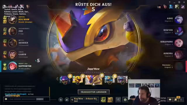 03:20:23Es wird die Frustration über den Champion Kog'Maw deutlich, insbesondere hinsichtlich des geringen Schadens, den er verursacht, und der schlechten Spielerlebnisse. Es wird infrage gestellt, ob das Q-Maxen von Kog'Maw mittlerweile sinnvoll ist und der Wunsch geäußert, es in der nächsten Runde erneut zu versuchen, falls die aktuelle verloren geht. Die häufige AFK-Präsenz eines Zoe-Supports wird kritisiert, da dies das Spiel negativ beeinflusst und als 'baiting' empfunden wird. Die allgemeine Unzufriedenheit mit Kog'Maw wird verstärkt durch wiederholte Begegnungen mit AFK-Spielern oder unpassenden Champion-Picks im Team. Es wird betont, dass das Spielen von Kog'Maw, sowohl AP als auch AD, keinen Spaß macht und durch das Verhalten der Mitspieler zusätzlich erschwert wird.
