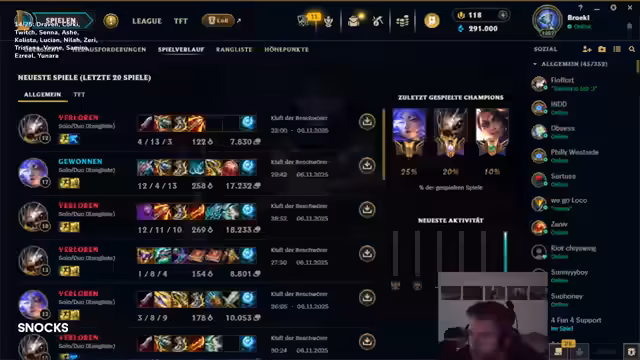 05:21:09Der Streamer gibt sein ADC-Projekt als beendet aus, nachdem er nach 13 Siegen und 30 Niederlagen feststellte, dass es ihm keinen Spaß mehr macht. Vor allem Kog'Maw erwies sich als persönliches Kryptonit. Trotzdem blickt er positiv in die Zukunft und kündigt zwei Streams für den nächsten Tag an: einen morgens mit League und abends ein Quizformat. Er bleibt ehrlich bei seiner Kritik, zeigt aber gleichzeitig den Wunsch, den Zuschauern gute und unterhaltsame Inhalte zu bieten.