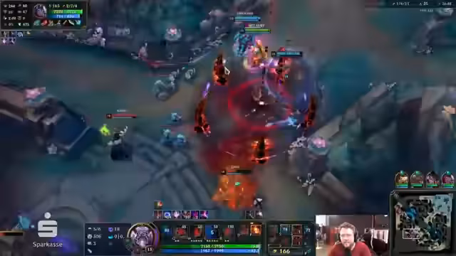 02:49:05Das Spiel nähert sich dem Ende. Der Streamer kommuniziert die fehlenden ultimativen Fähigkeiten und überlegt, ob ein Angrauf auf den Nexus möglich ist. Nach dem Tod mehrerer Spieler, darunter 'Pugli' und 'Abhilus', ist die Lage hoffnungslos. Das Spiel wird verloren, und der Streamer reflektiert kurz über die Spielweise und den Ansturm des Gegners.