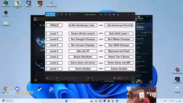 01:22:39Nach einer kurzen Pause und einem Essensplan beginnt die Hauptaktivität des Bootcamps: die FlexQ-Challenge. Die Teilnehmer spielen in flexiblen Teams, bei denen bei jedem Sieg die Schwierigkeit der Herausforderung steigt. Die Challenges werden vor jedem Spiel zufällig festgelegt und reichen von spielerischen Beschränkungen wie 'keine Rüstungsitems' bis hin zu komplett verrückten Regeln wie 'keine Champion mit Flash'. Das Ziel ist es, verschiedene Handicaps zu meistern und das Teamgeist zu fördern, während der Streamer die Fortschritte kommentiert und unterhält.