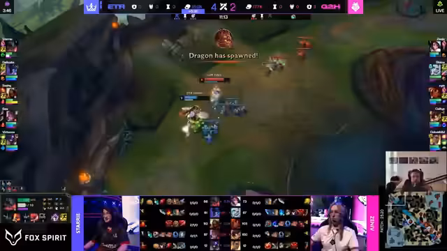 00:08:03Nach dem Start des ersten Spiels analysiert der Caster die Draft-Entscheidungen beider Teams. Bei G2 kritisiert er die Kombination aus Trundle und Sion, da diese gegen den Varus von Aeterna keine optimale Match-up darstellen und Aeterna keinen Nutzen daraus ziehen kann. Eterna wird ebenfalls kritisiert, da es auf der Supportposition einen Fehler gemacht hat, indem es auf Nautilus setzte, anstatt einen Engager wie Leona oder idealerweise Braum zu wählen, um eine starke Frontline zu etablieren.