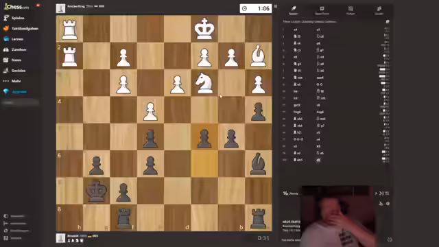 07:23:18Nach einem League of Legends Spiel beginnt eine Schach-Partie. Der Streamer analysiert seine Züge und kritisiert sich selbst für seine 'dumme' und 'langsame' Spielweise. Er fühlt sich wie ein kleiner 'Knicker-King'. Er beschreibt die Stellung als 'arschcheiße' und äußert Frustration über seine eigene Leistung. Ein Schachzug wird als 'starker Move' beschrieben, jedoch gibt er auch an, den Zug vielleicht etwas zu leicht gemacht zu haben.
