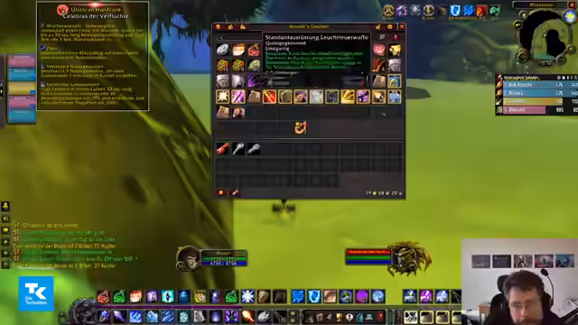 06:34:24Nach dem Questfortschritt im Tempel wendet sich die Gruppe wieder kleineren Quests zu. Die Verteilung der Belohnungen, wie der überragenden Mana-Tränke, wird offen diskutiert. Die Spieler verfeinern ihre Buff-Strategie, wobei Kaddi und Cardi sich gegenseitig Intelligenz-Buffs geben und festlegen, einen höheren Wert anzustreben. Die Gruppe kämpft mit vollen Inventaren und nutzt das Quest-Item-Tausch-System von WoW, um Platz zu schaffen. Es entstehen neue Pläne für zukünftige Runs und die Frage, wie man neue Spieler in die Gruppe integrieren kann.