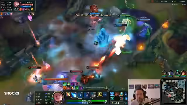 03:10:17Das Team plant, das Hörnchen (Drache) zu eliminieren, während der Gegner ebenfalls versucht, den Drake zu nehmen. Der Streamer ist optimistisch, das Team besiegen zu können, und bemerkt, dass der Yasuo fehlt. Die Kommunikation im Team funktioniert nicht immer perfekt, wie ein missglückter Charm und unkoordinierter Move zeigt.