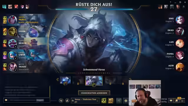 06:39:28Zum Ende des Streams kündigt der Streamer seinen weiteren Plan für den Abend an. Um 19 Uhr beginnt ein Fußballspiel, bis dahin möchte er wahrscheinlich noch ein Solo-Q-Spiel machen oder einen 'Entbann-Stream' abhalten. Er erklärt den Titel 'Material für Videos farmen' damit, dass er mehrere Games mit Varus gespielt hat, um Material für geplante Videoreihen über ADC-Masterclass und Champion-Itemisierung zu sammeln.